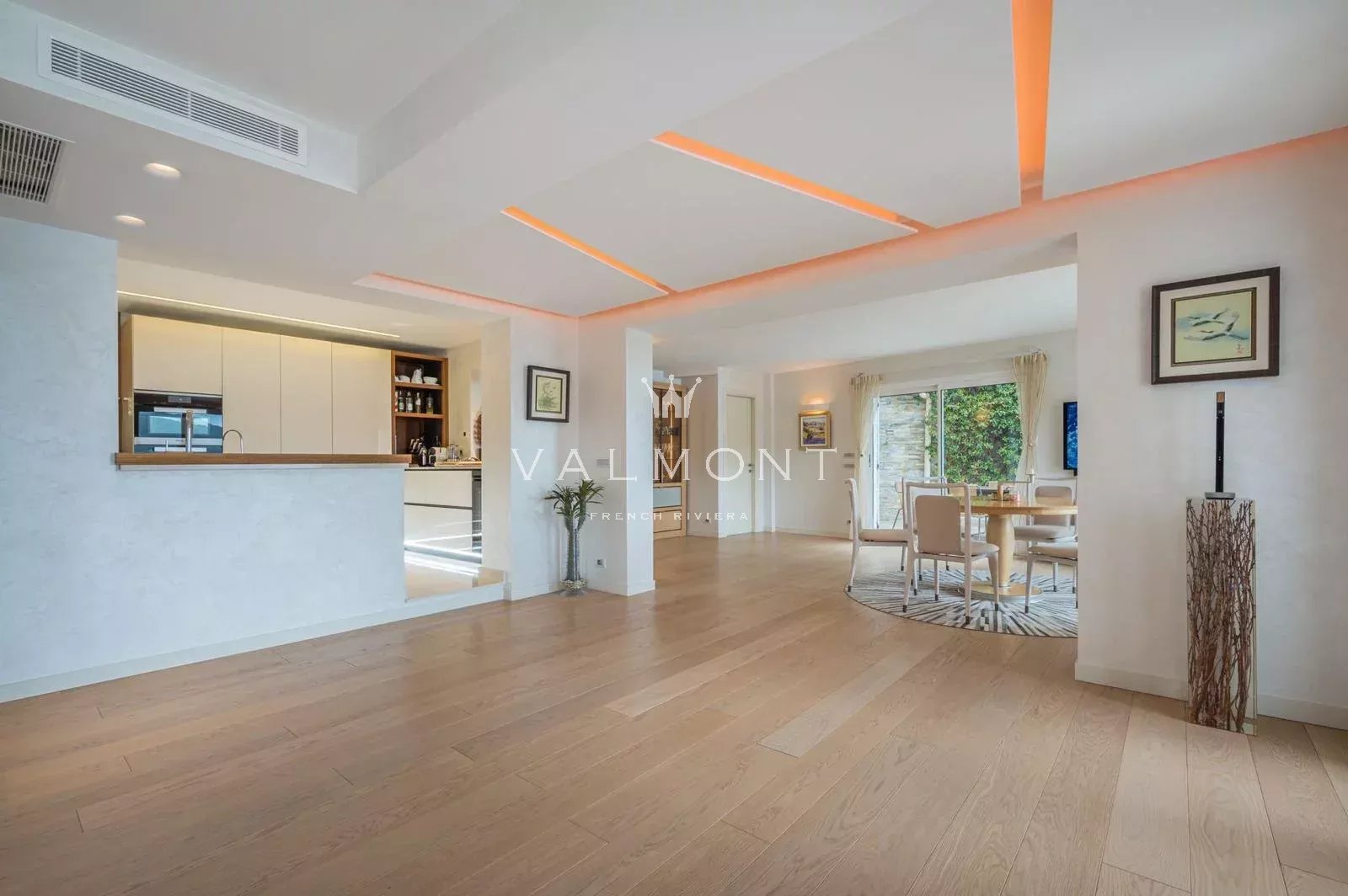 Au rez-de-chaussée, un vaste espace de vie et de réception s’ouvre sur une cuisine ouverte entièrement équipée. Ce niveau comprend également une petite chambre et une buanderie.