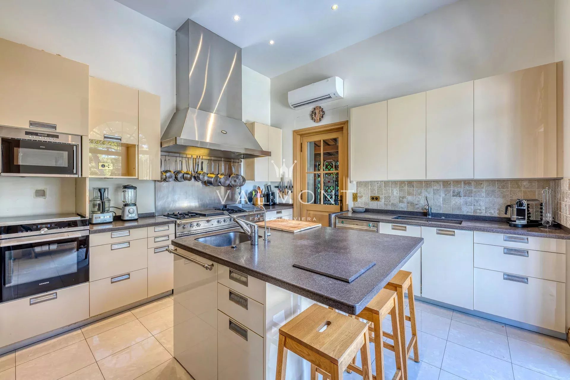 Les terrasses dévoilent une vue imprenable sur la mer et la baie de Villefranche. Le jardin, agrémenté d’une piscine, invite à la détente sous le ciel azuréen. Une porte discrète, en contrebas, permet un accès direct à la plage à pied.