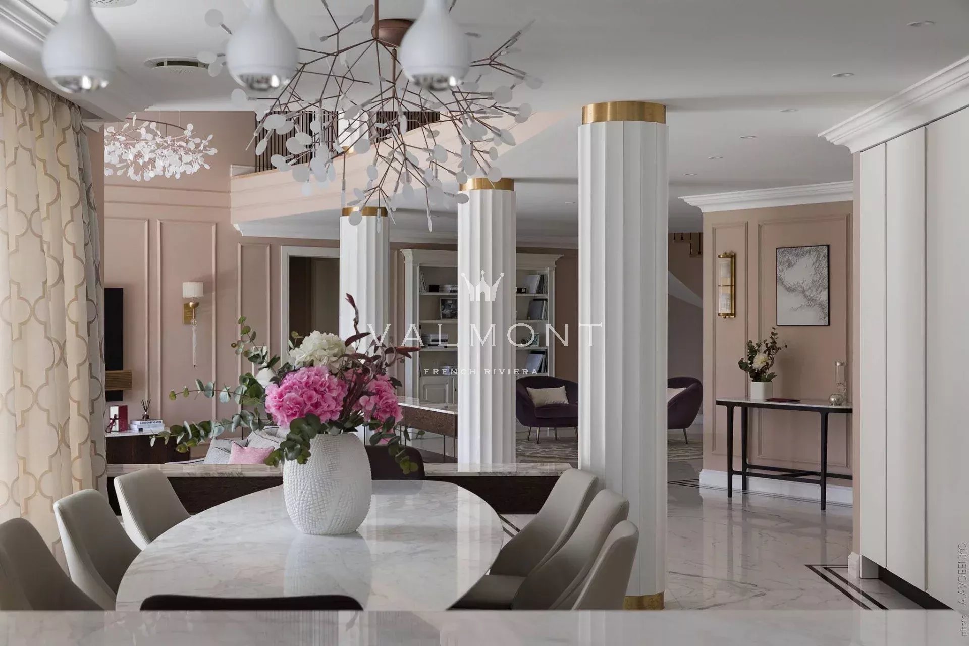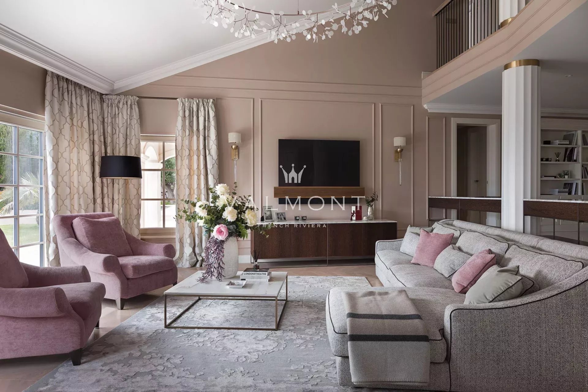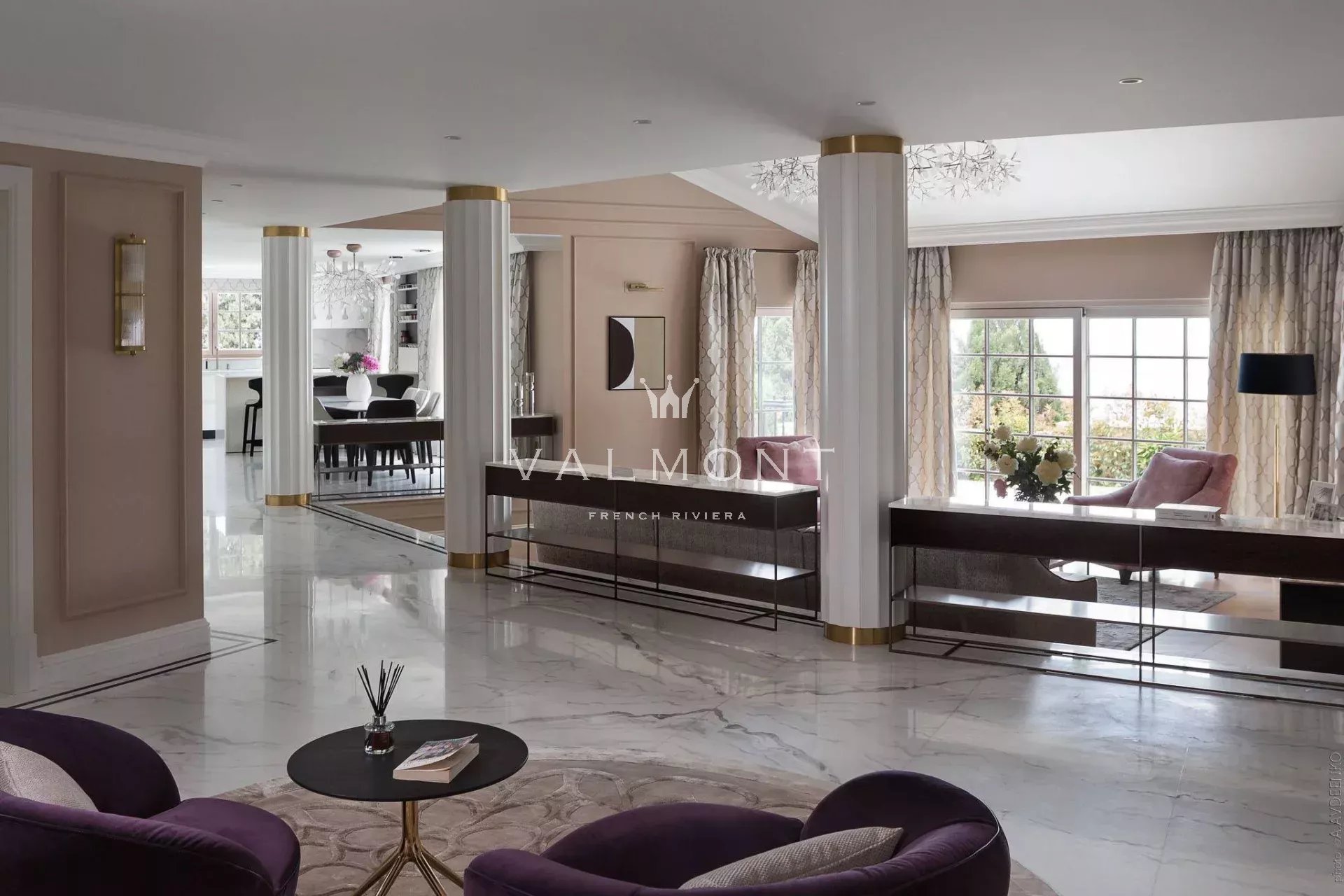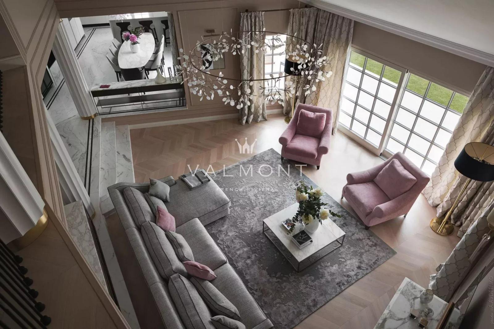 Un vaste hall d’entrée mène à un double séjour, une salle à manger et une cuisine indépendante entièrement équipée. Les principales pièces de vie s’ouvrent naturellement sur une grande terrasse et un jardin paysager, renforçant la sensation d’espace et de lumière.