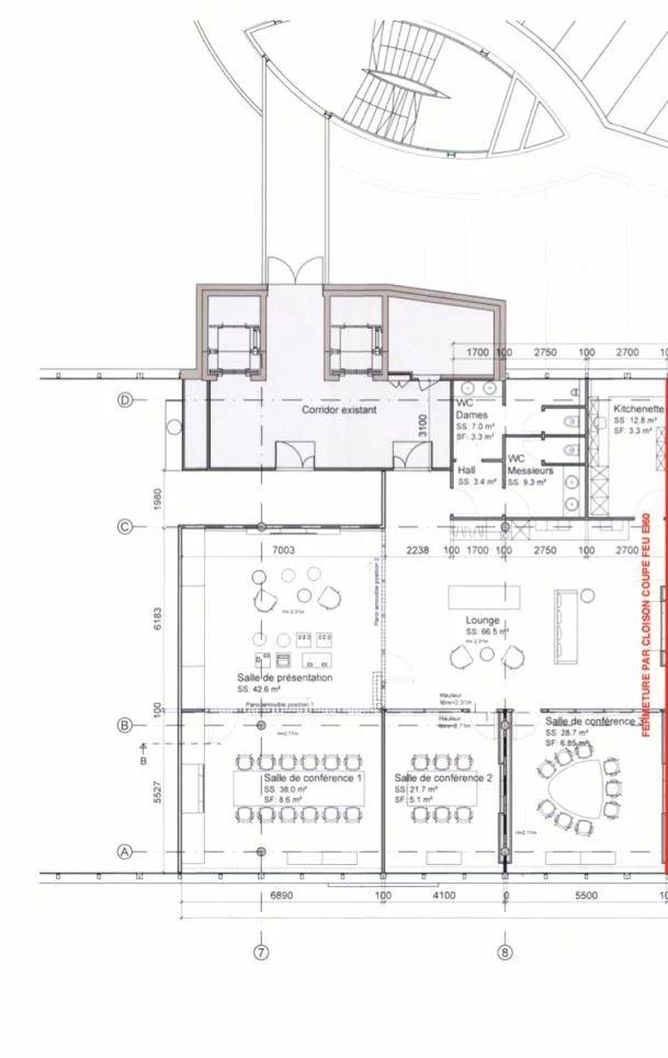 Ce bel espace dispose de deux entrées indépendantes et est accessible par trois ascenseurs.