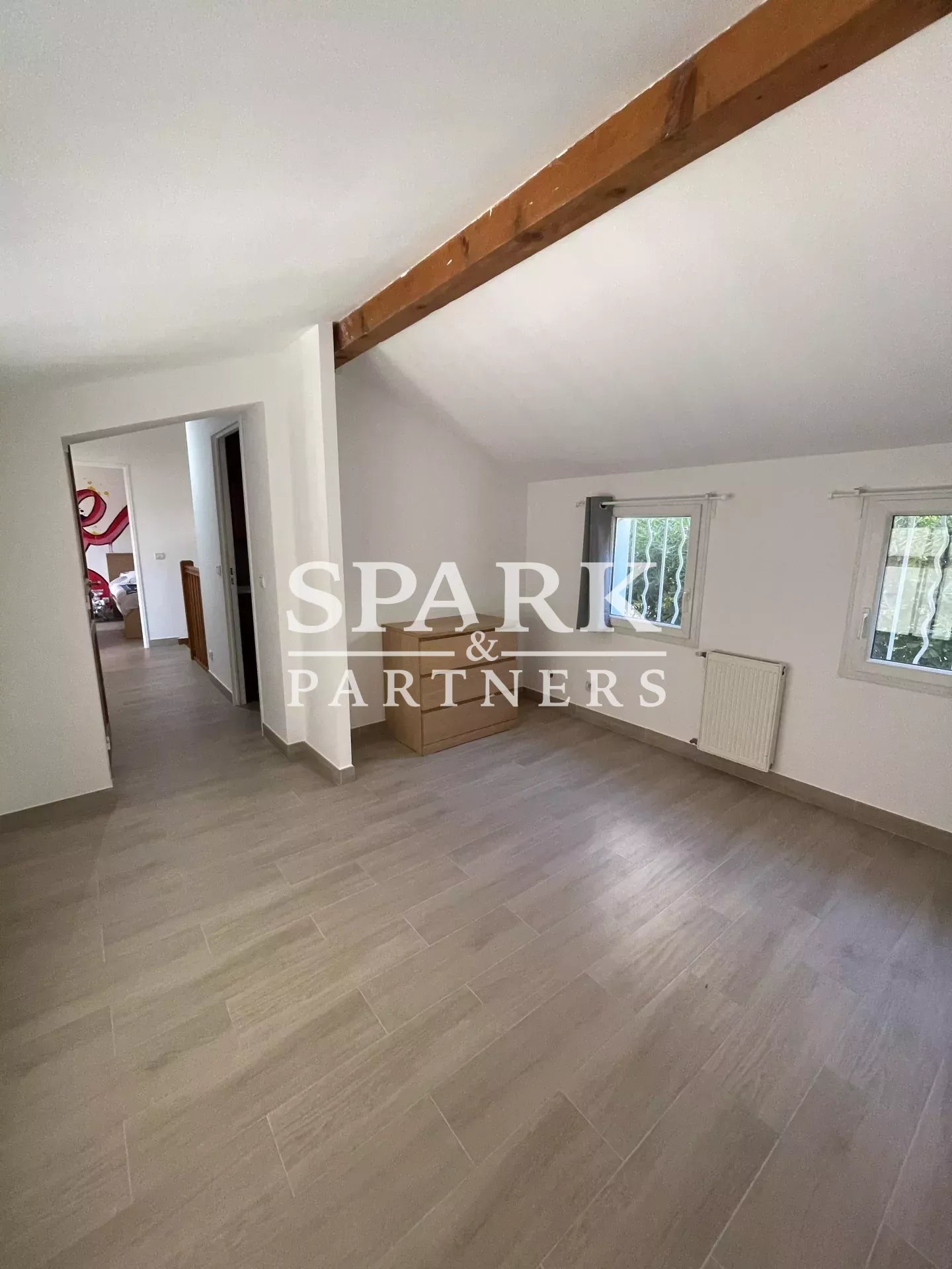 À l'étage, la suite parentale dispose d'une salle d'eau privative, d'un espace bureau et d'un dressing. Deux autres grandes chambres, une salle d'eau et un WC séparé complètent cet espace nuit.