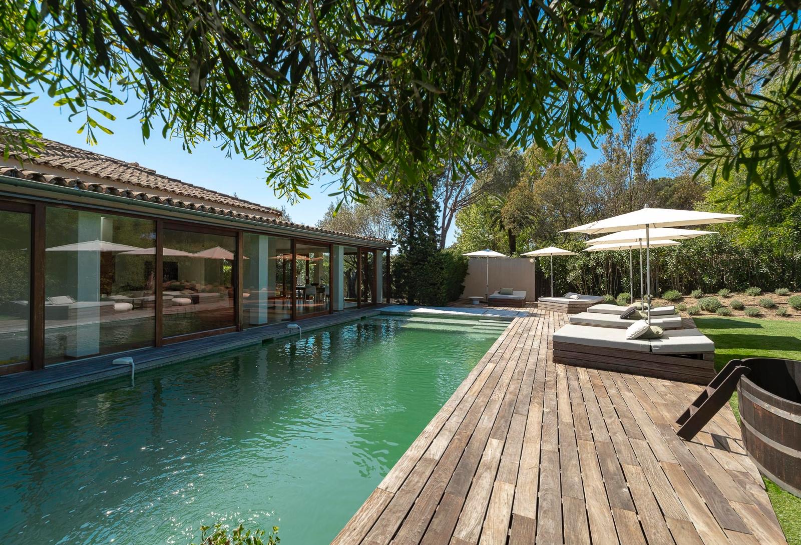À l’extérieur, la villa bénéficie d’une piscine et d’espaces extérieurs accueillants, idéaux pour se détendre sous le soleil méditerranéen et profiter de longues journées d’été en sérénité totale.