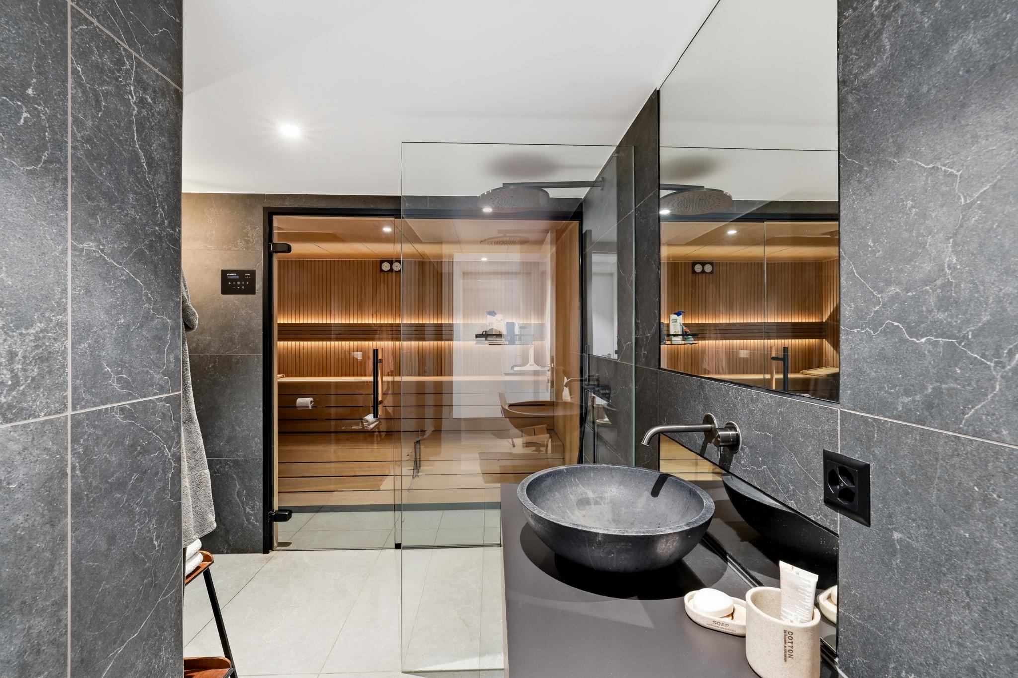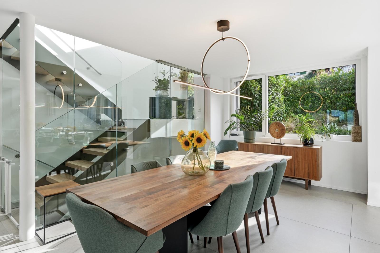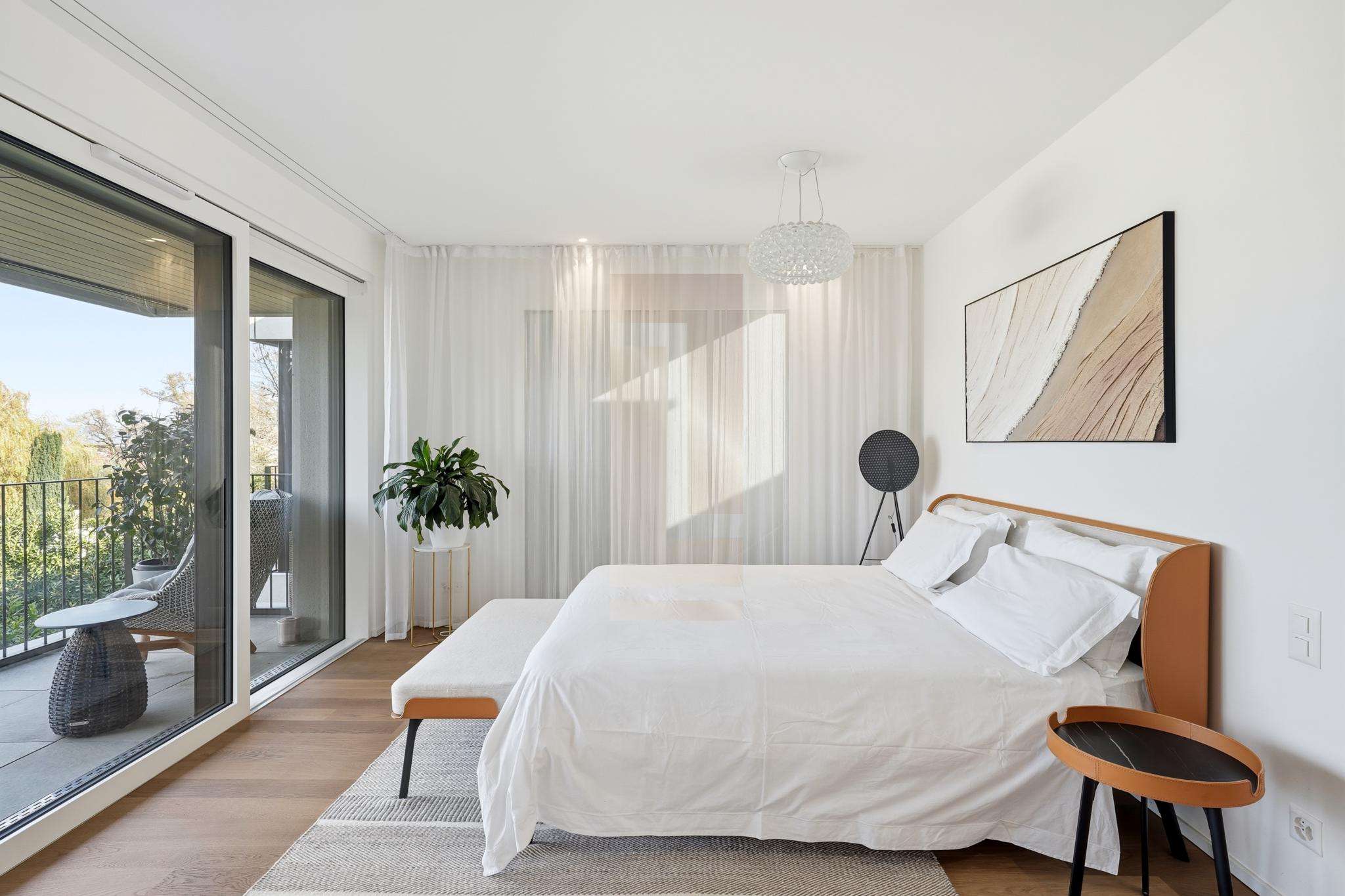 La circulation s’organise autour d’un patio central paysager desservant les deux niveaux supérieurs. Le rez-de-chaussée abrite une cuisine haut de gamme entièrement équipée avec espace repas, ainsi qu’un salon prolongé par une terrasse et un jardinL’étage se compose d’une chambre principale avec salle de bains en suite, dressing et belle terrasse avec vue sur le lac, ainsi que de deux chambres supplémentaires et d’une salle de bainsLe sous-sol comprend un accès au parking souterrain (2 places), un abri atomique aménagé pouvant faire office de chambre d’appoint, un sauna avec salle de bains, une buanderie et les locaux techniques.