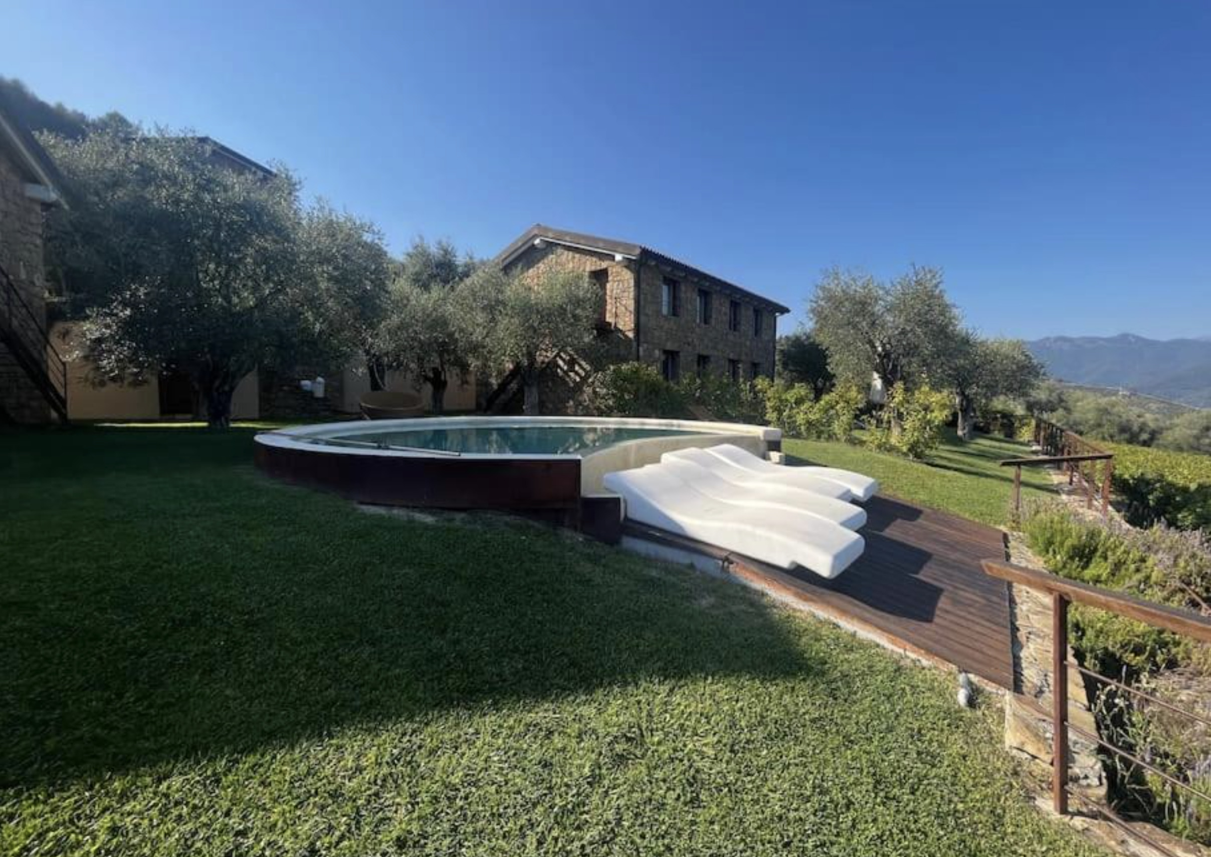 À l’extérieur, dans le jardin au milieu des oliviers, une piscine rafraîchissante invite à la détente. Tout semble évoquer un monde magique et lointain, aujourd’hui oublié : Dolceacqua, Sanremo, Monaco et la Côte d’Azur ne sont qu’à quelques kilomètres… tout près.