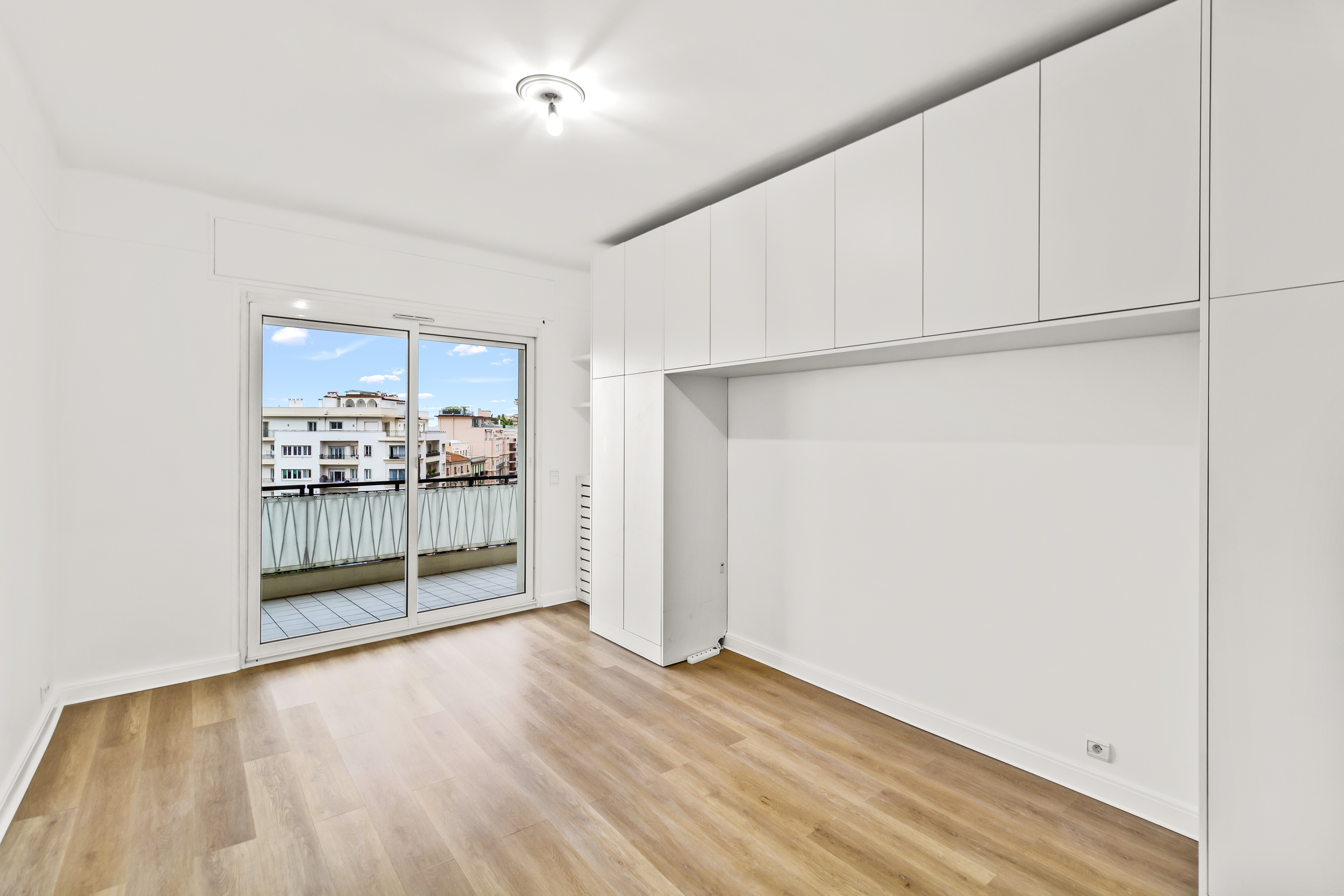 L'appartement comprend une entrée, un vaste séjour, trois chambres dont deux ouvrant sur la terrasse, deux salles de bain, un WC invités, un dressing et une cuisine indépendante. L’appartement est lumineux, bien distribué, et la terrasse offre une vue dégagée sans vis-à-vis sur la ville et le square du Trocadéro, avec une échappée mer.