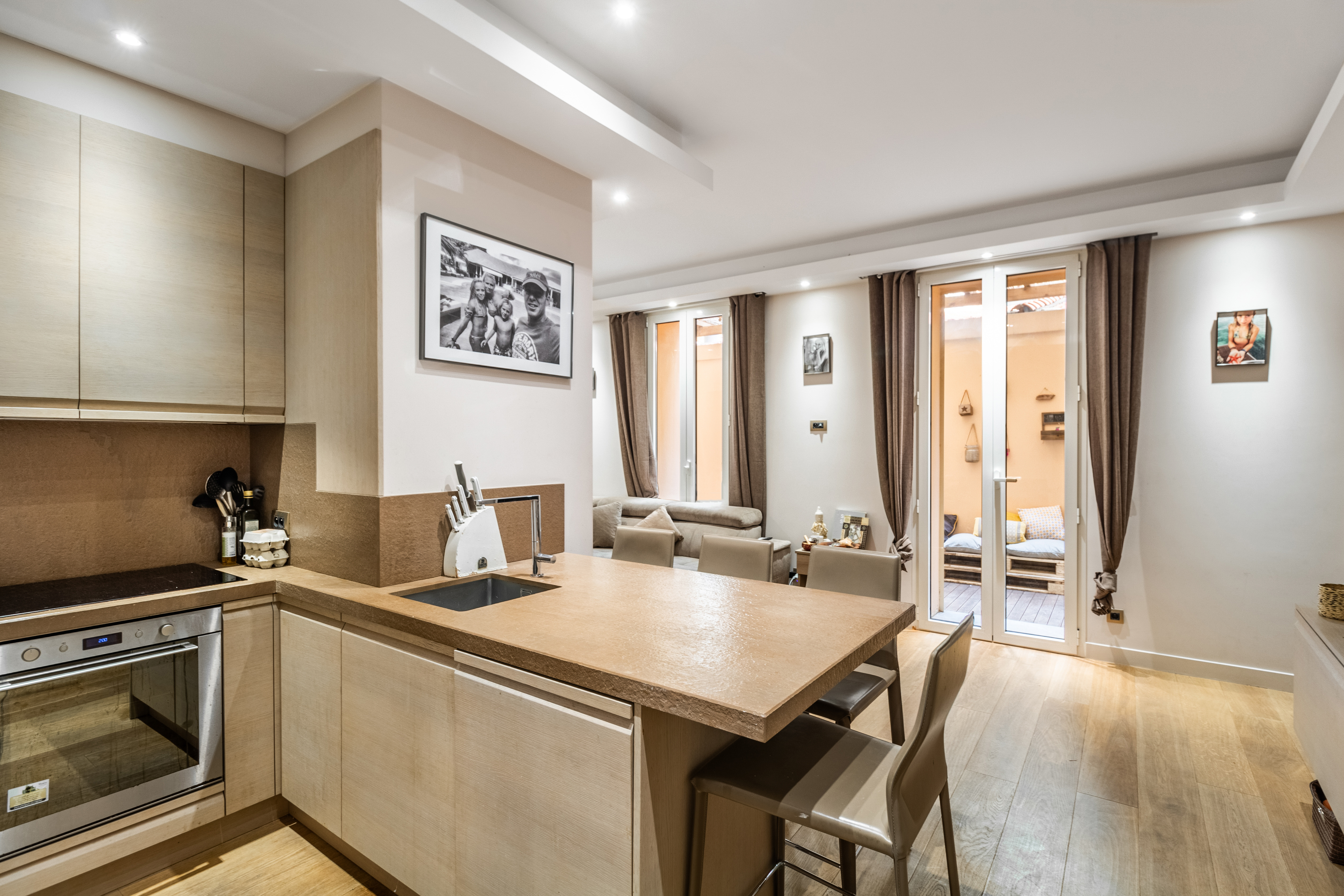 • séjour avec cuisine ouverte, s'ouvrant sur une grande terrasse