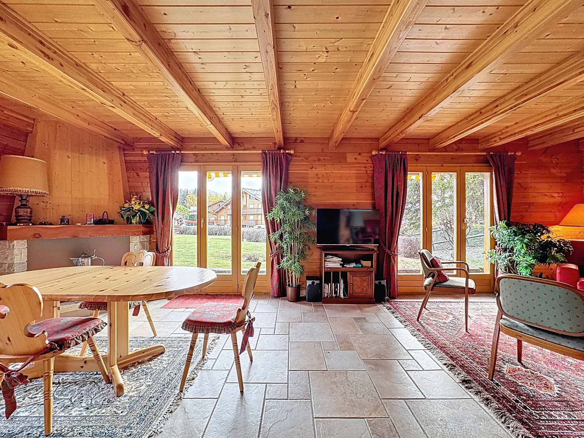 La propriété s'étend sur un terrain de 2'789 m2 clôturé avec parking extérieurs, comprenant un magnifique jardin. Elle dispose d'un premier chalet (Chalet Napoléon) d'environ 240 m2 composé de 4 chambres et d'un garage double, et d'un second chalet (chalet Joséphine) d'environ 180 m2 également composé de 4 chambres et d'un garage double. Les deux chalets sont reliés par un vaste sous-sol avec de grandes pièces polyvalentes d'environ 400 m2 d'espaces utiles.