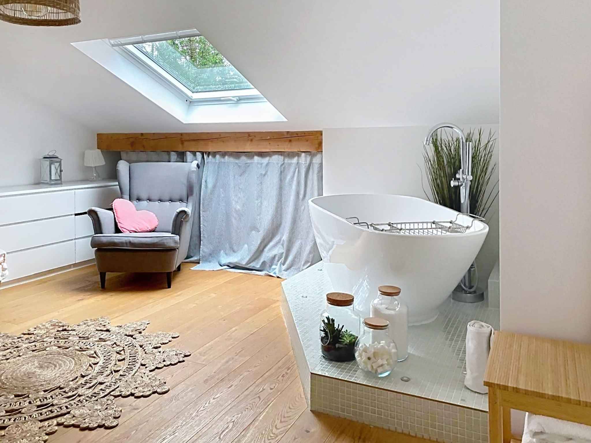 Au 2ème étage, se trouvent une spacieuse chambre parentale avec baignoire, une chambre à coucher supplémentaire et une salle de douche avec WC.