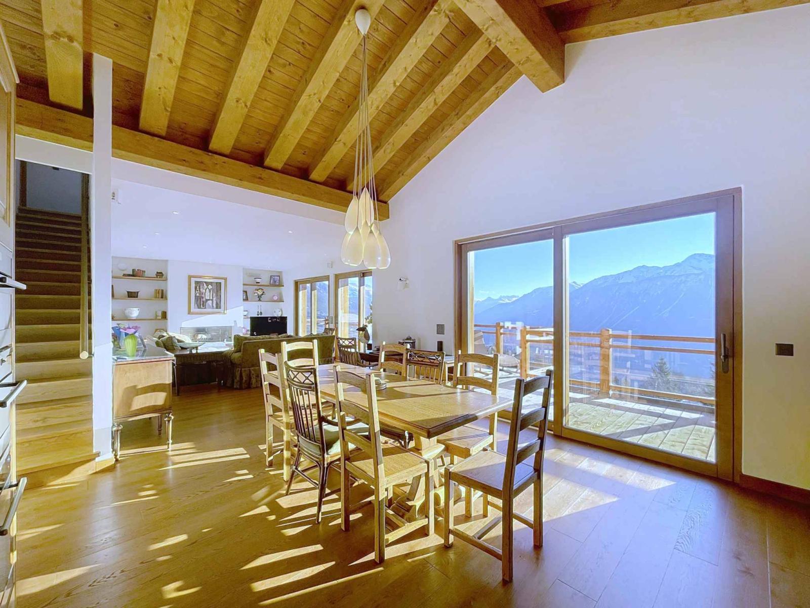 BARNES I Crans-Montana vous propose ce magnifique chalet coup de cœur, bénéficiant d’une vue panoramique sur les Alpes et les sommets des 4000 mètres, dont le Cervin. Situé dans un quartier résidentiel et bucolique recherché, il se trouve à seulement 5 minutes du centre de la station.