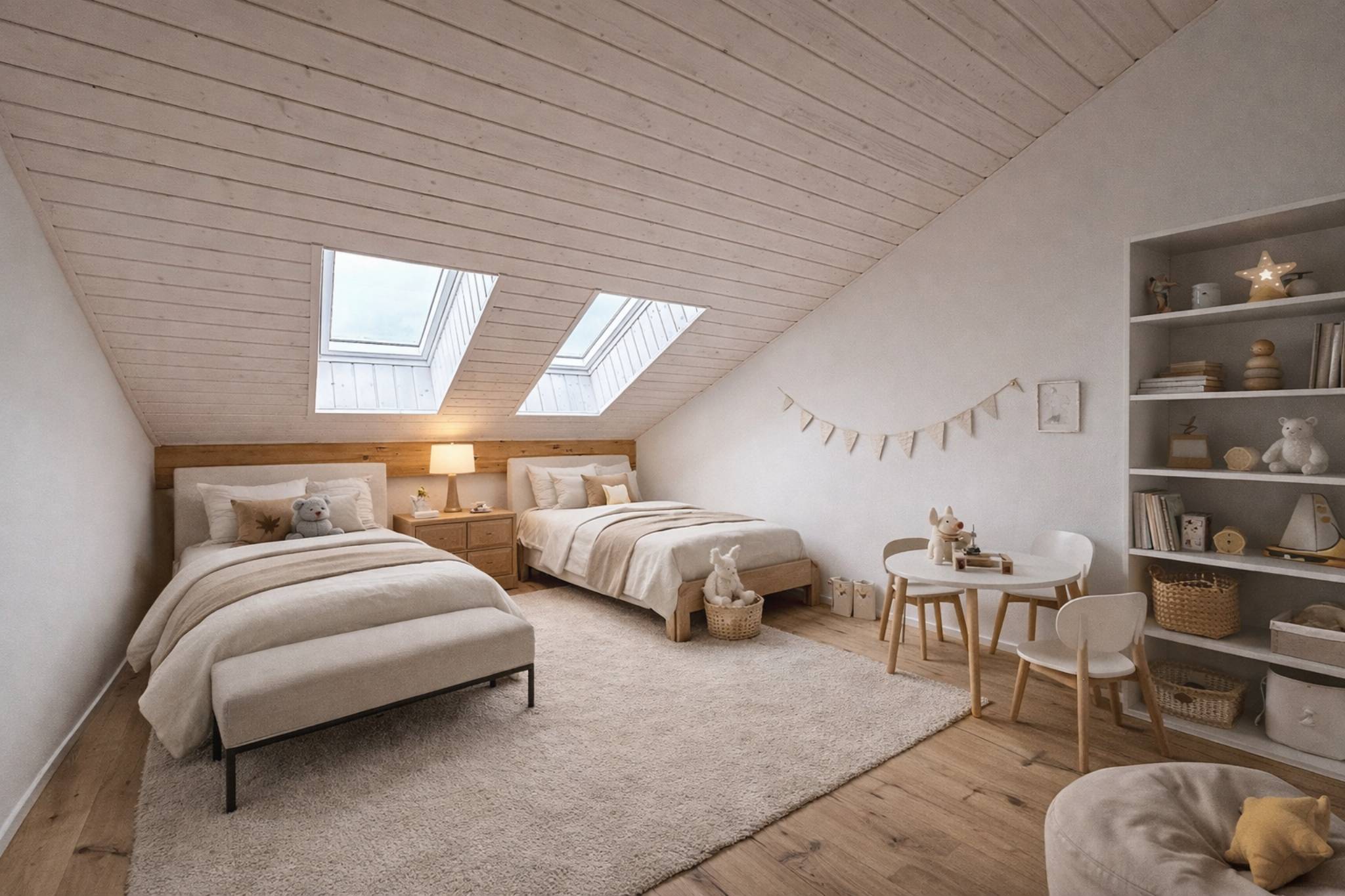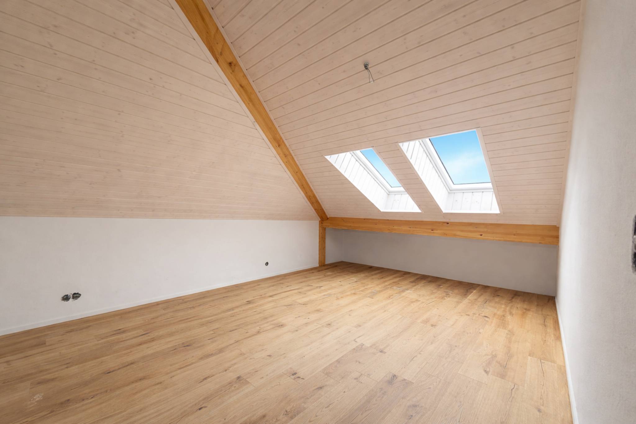 Les combles abritent deux chambres supplémentaires, une salle de bain avec baignoire ainsi qu’un espace de rangement/bureau. Les matériaux choisis témoignent d’un goût sûr et d’un réel souci de qualité : parquets chaleureux, carrelages grands formats, équipements durables.