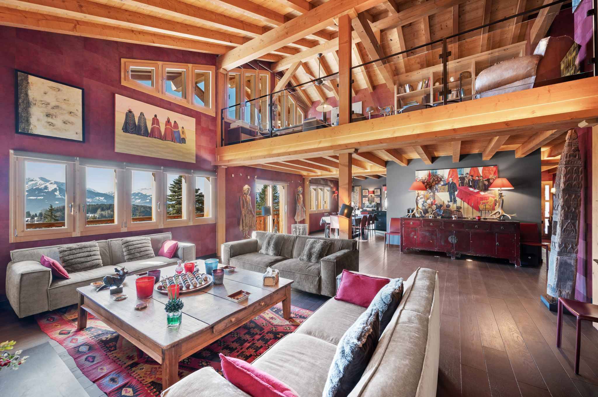 Le séjour, majestueux avec son plafond cathédrale et sa cheminée, s’ouvre sur une terrasse offrant une vue panoramique sur les Alpes.