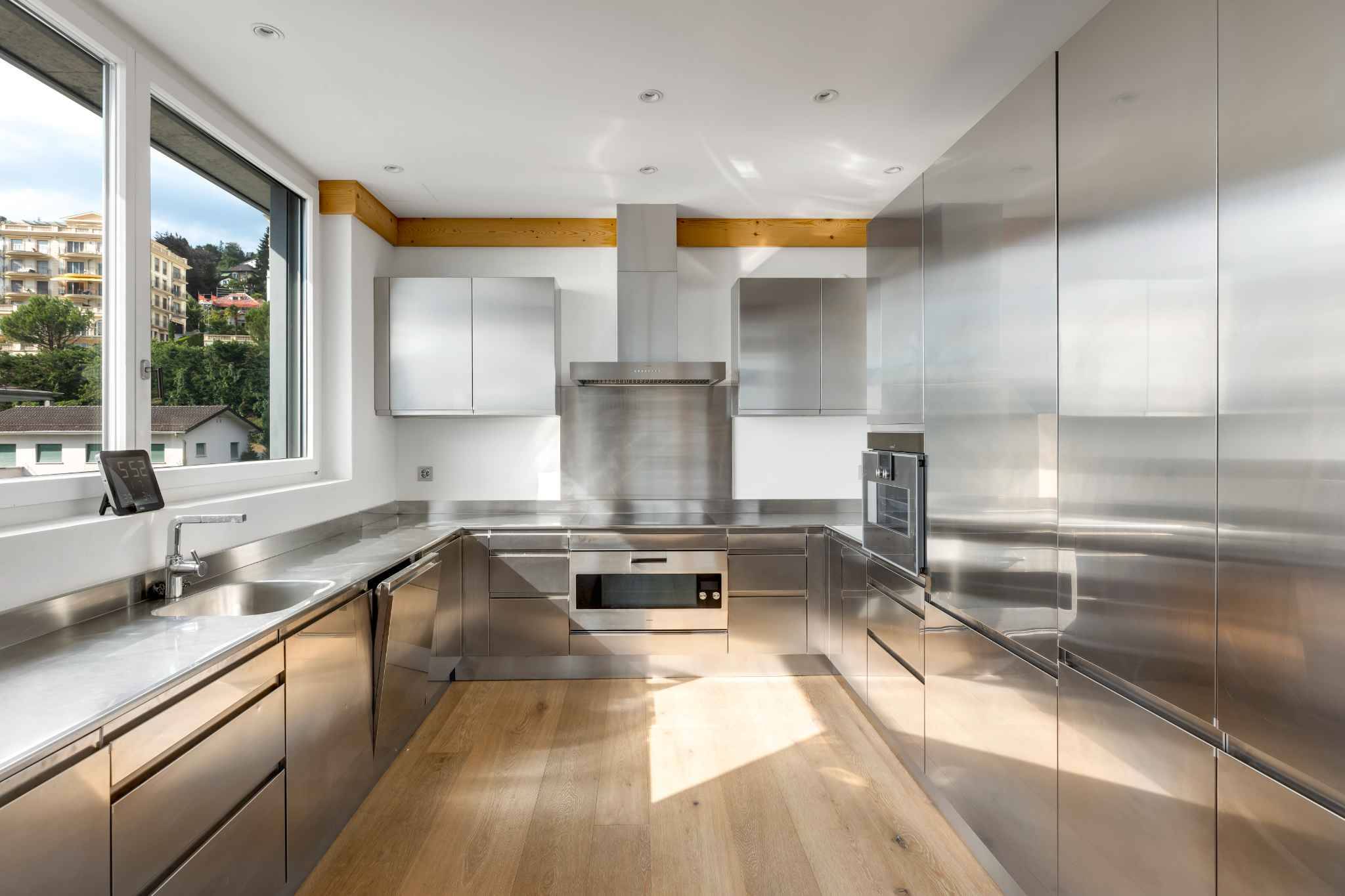 - Une grande cuisine en acier inox, entièrement équipée avec des appareils électroménagers haut de gamme, et une porte coulissante donnant sur l’espace salle à manger.