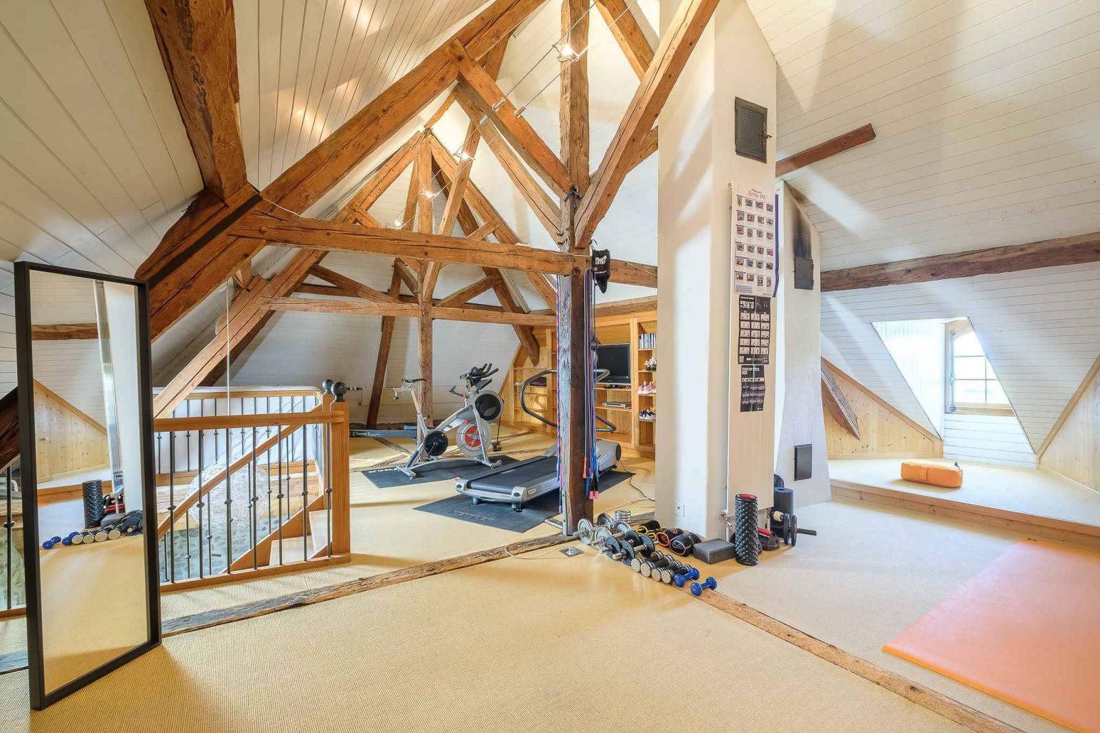 Le deuxième niveau avec ses poutres apparentes et sa belle hauteur sous plafonds offre un très grand espace actuellement aménagé en salle de sport avec une mezzanine et de nombreux rangements. 2 chambres supplémentaires sont également à disposition.