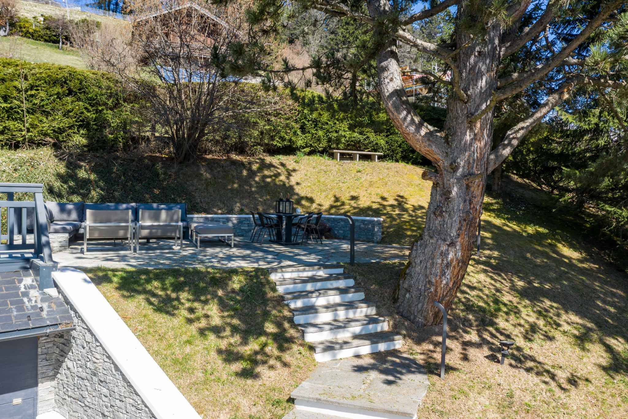 À l’extérieur, les terrasses orientées Sud, Est et Ouest ainsi que le jardin bucolique agrémenté de mélèzes centenaires, invitent à la détente en toutes saisons. Un jacuzzi s'ajoute à ce cadre idyllique.