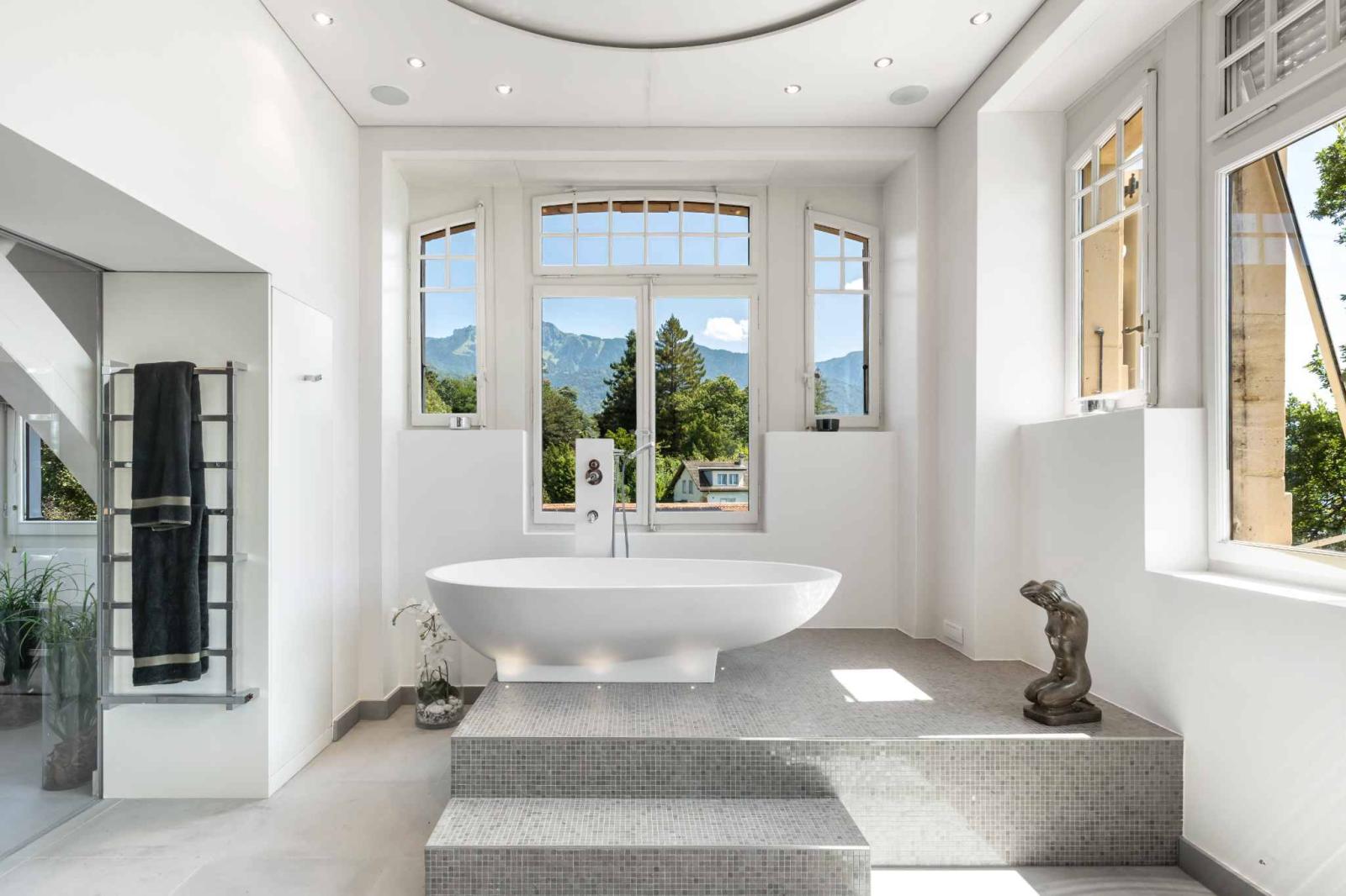 Les espaces intérieurs se caractérisent par une décoration raffinée et une luminosité exceptionnelle. Les pièces de vie s'ouvrent largement sur des panoramas spectaculaires, offrant une vue imprenable sur les montagnes et les paysages environnants.