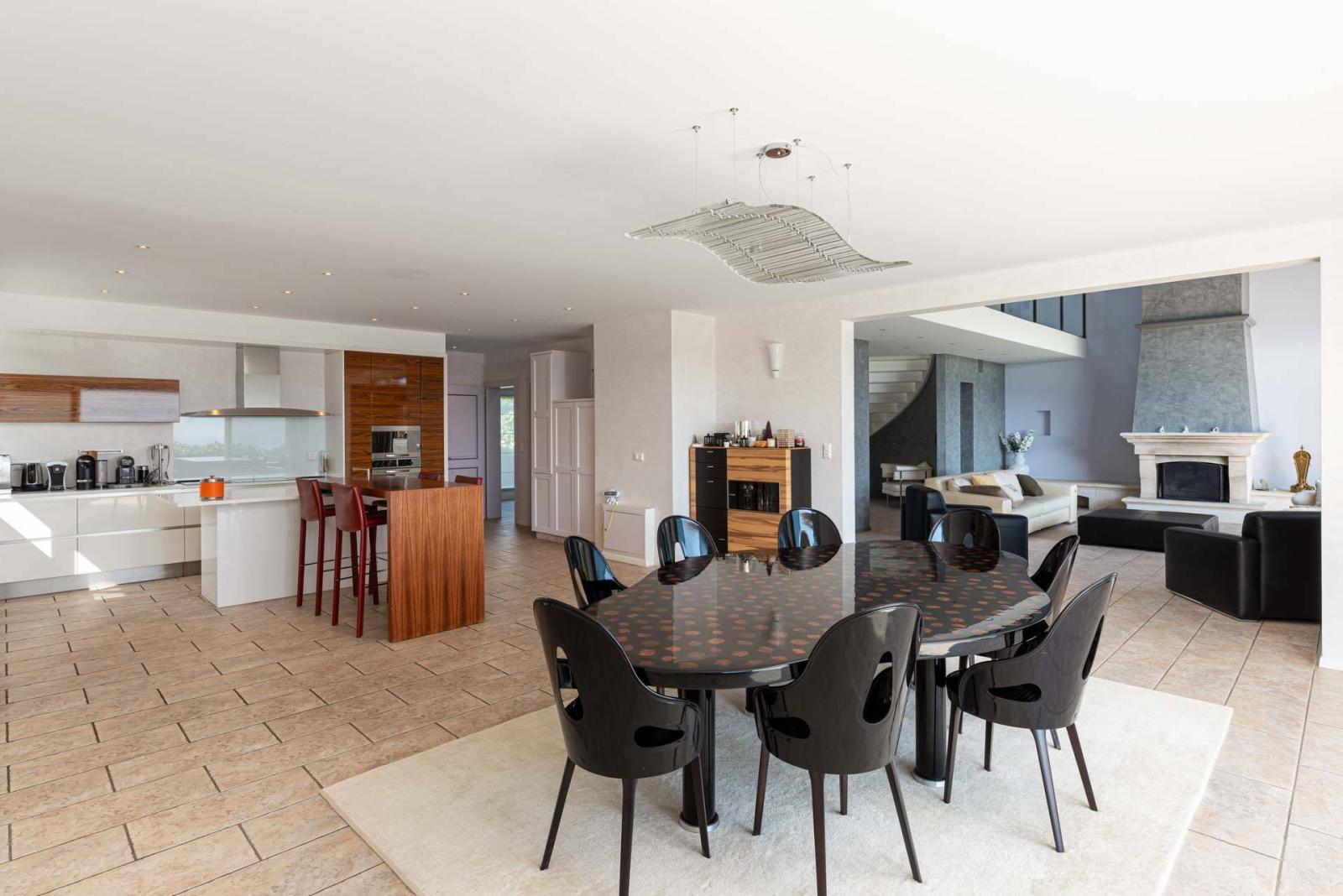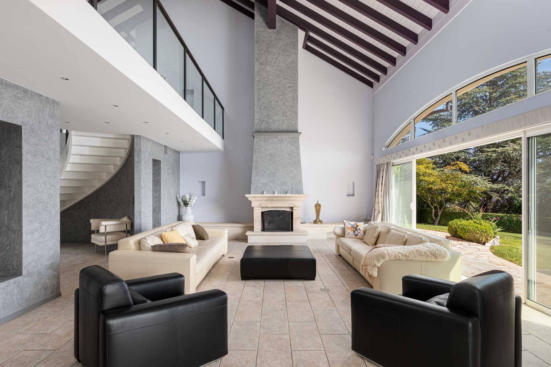 Dotée d'une vue imprenable, cette propriété dispose de volumes intérieurs impressionnants. Bénéficiant d'environ 500 m2 habitables, elle se compose d'une magnifique entrée avec double escalier, d'une vaste pièce de vie avec cheminée et d'une cuisine équipée avec un grand espace salle à manger.Un bureau, ainsi qu'un espace wellness occupent également ce niveau.