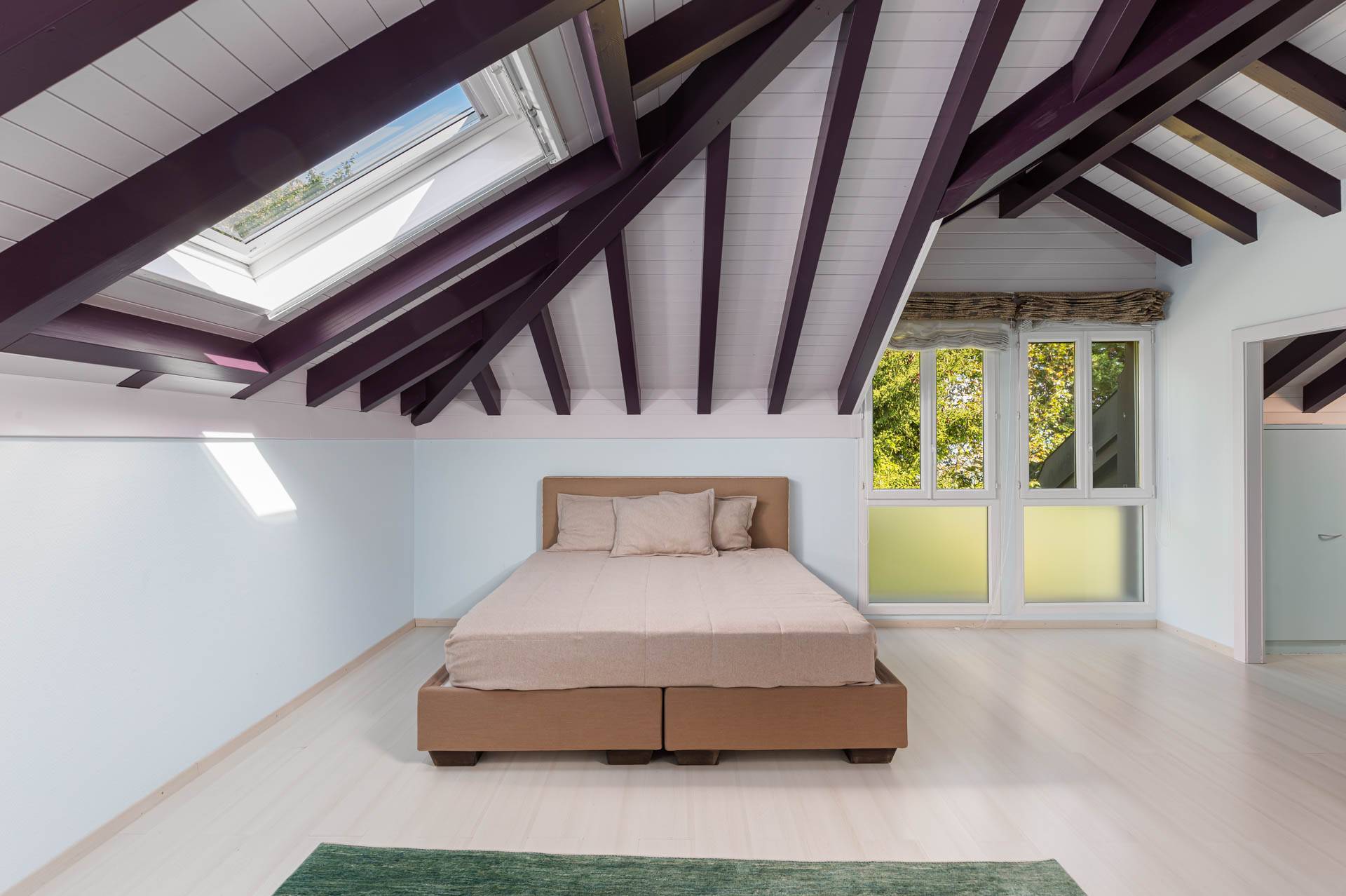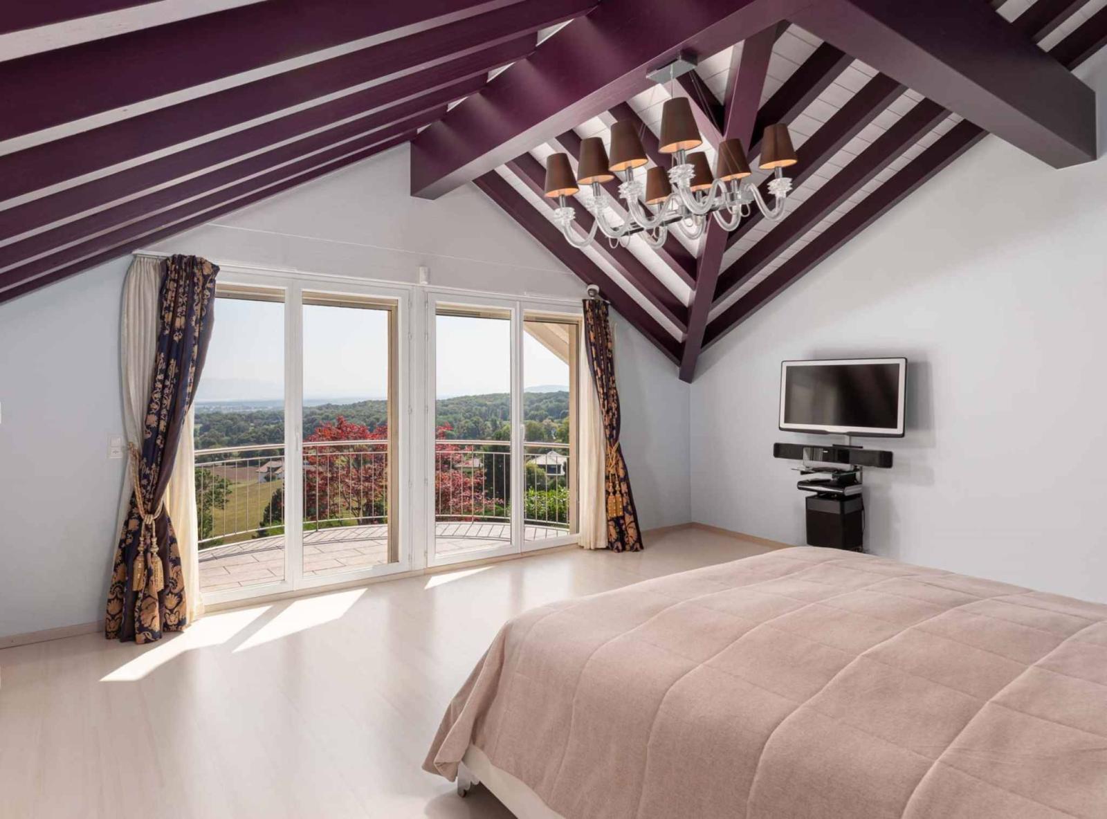 L'étage offre 3 agréables chambres avec salle d'eau en suite dont 2 avec accès à un balcon offrant une vue sur le lac et les Alpes, ainsi que la campagne environnante.