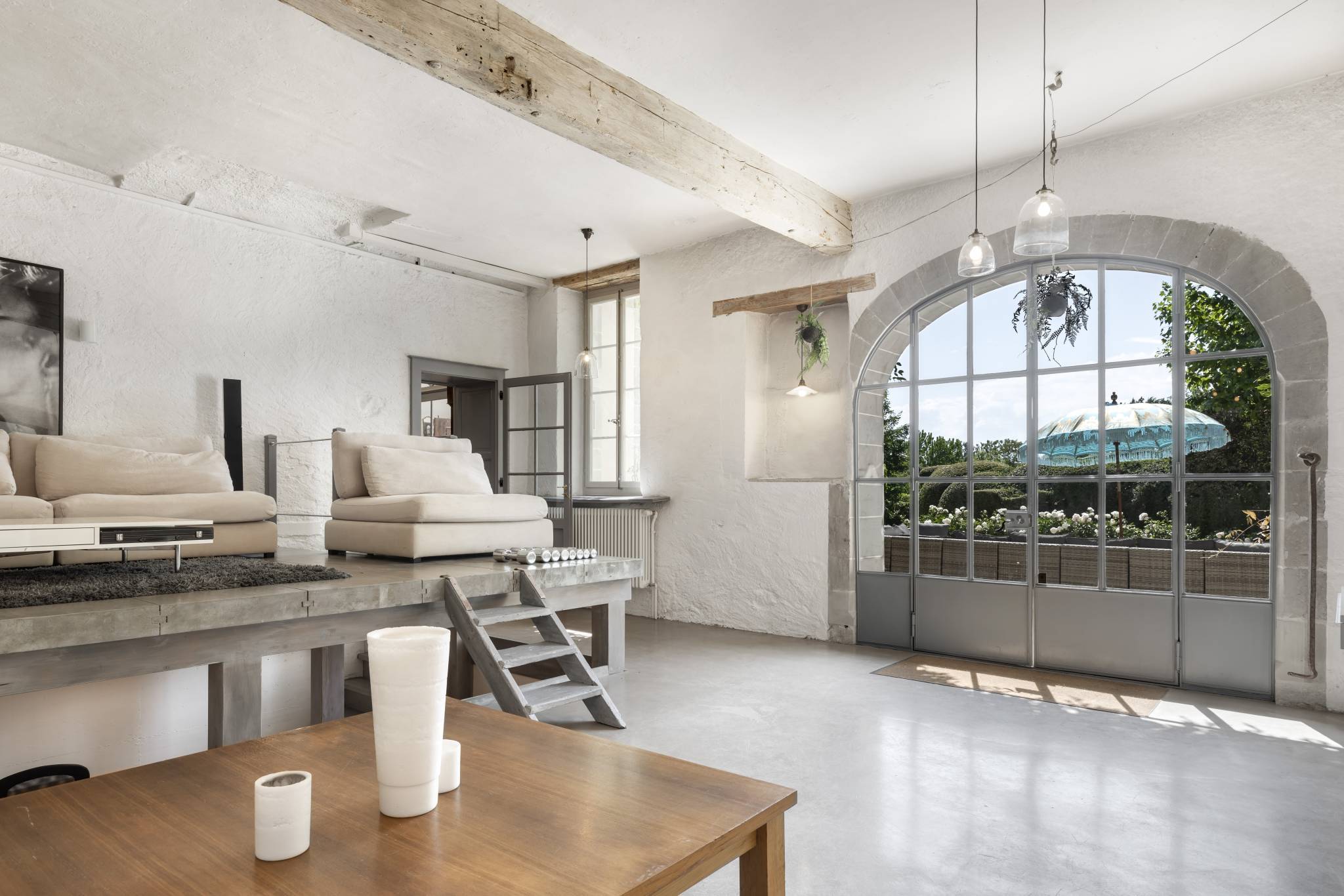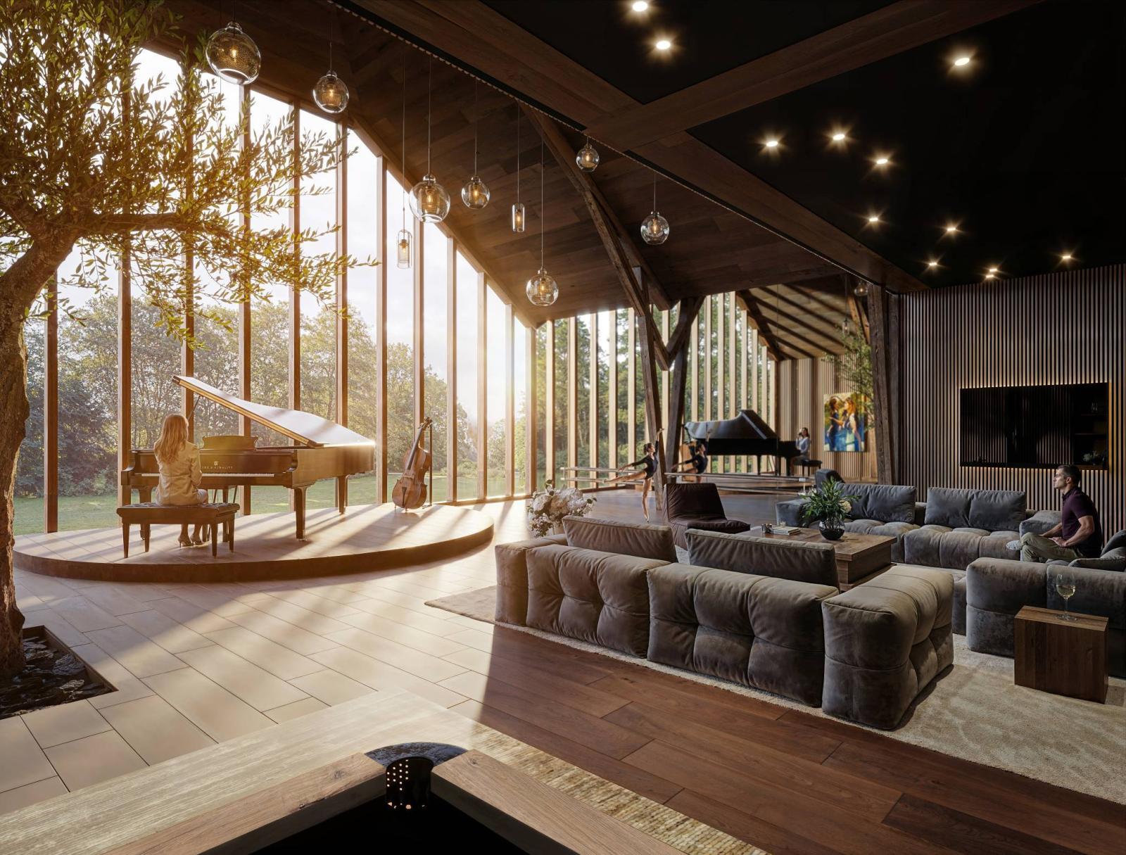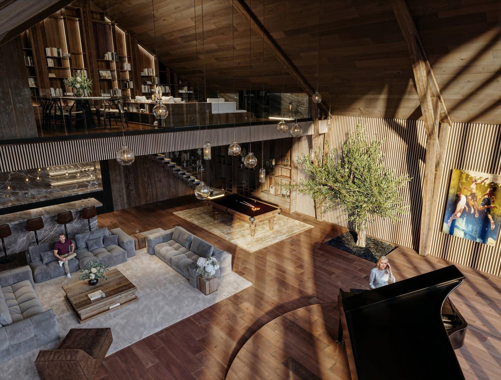 Un salon de musique de 150 m2 disposant de volumes généreux et d’une mezzanine abritant une bibliothèque.