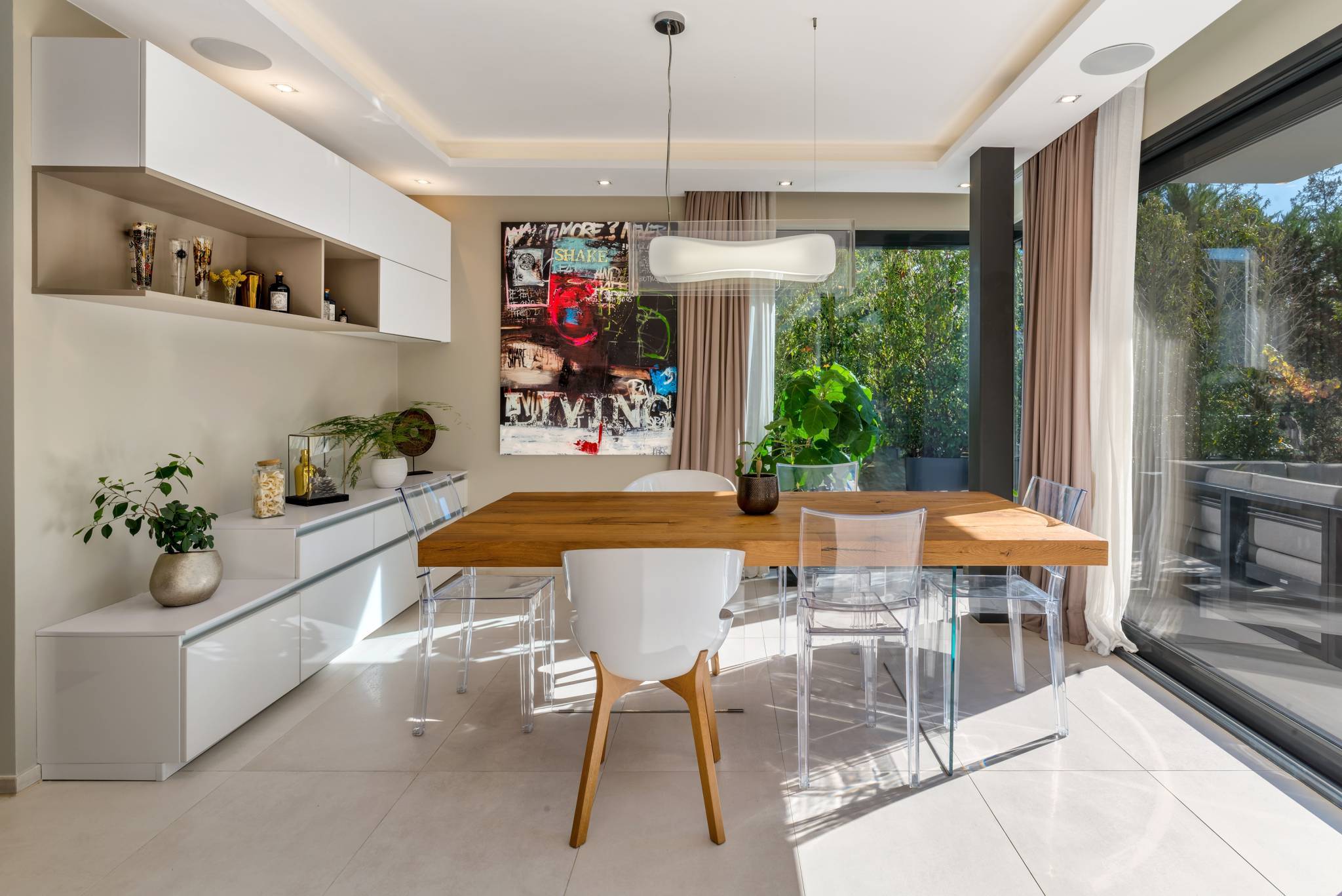 - Cuisine haut de gamme et électroménager de pointe (plan de travail en Dekton, façades en verre, hotte aspirante avec extraction extérieure)