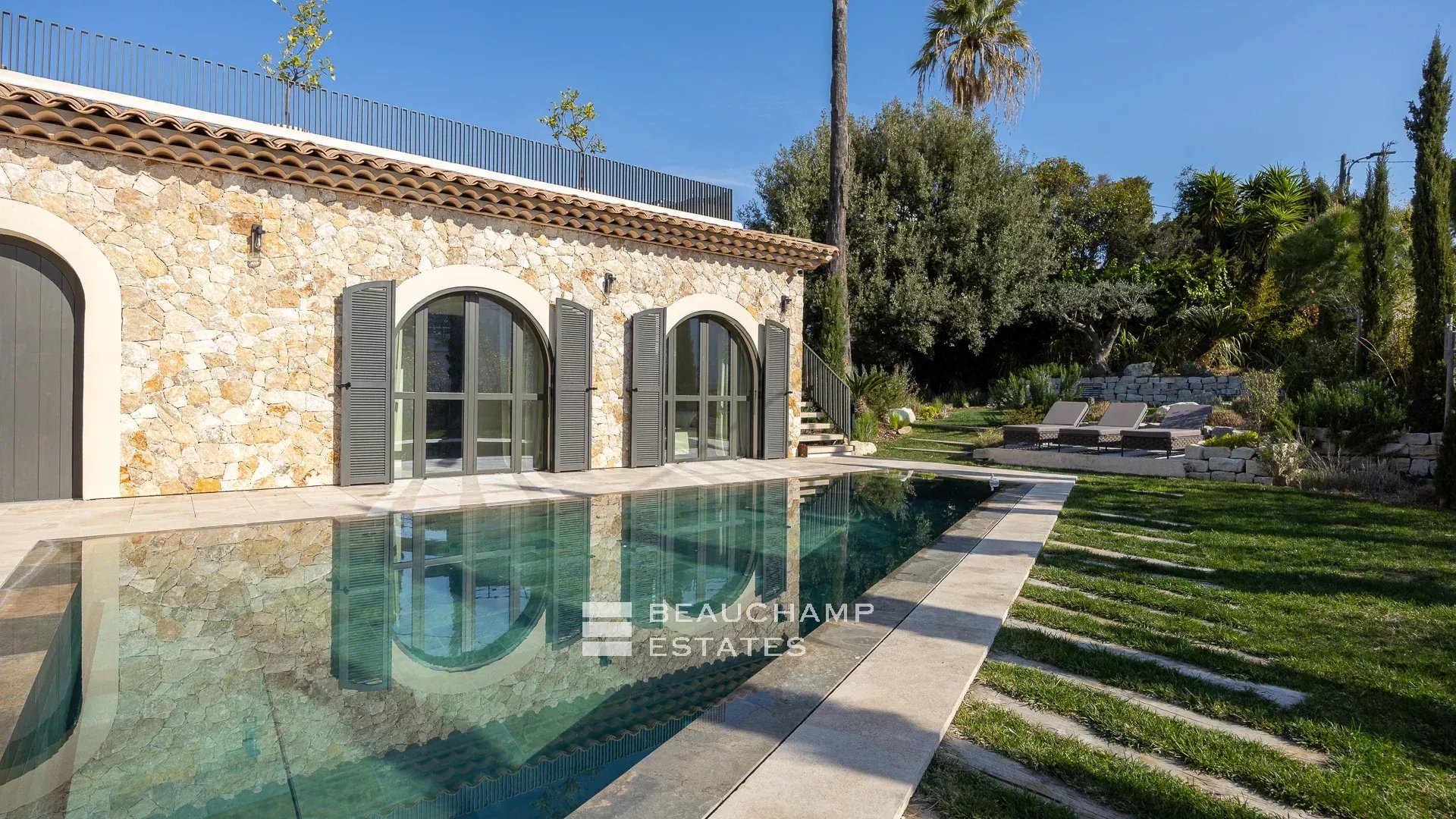 Développant une surface d’environ 314 m², la propriété s’étend sur un jardin paysager de 1334 m² et dispose d’une piscine balinaise. Elle jouit d’une vue imprenable sur la mer, le port et la baie de Cannes.