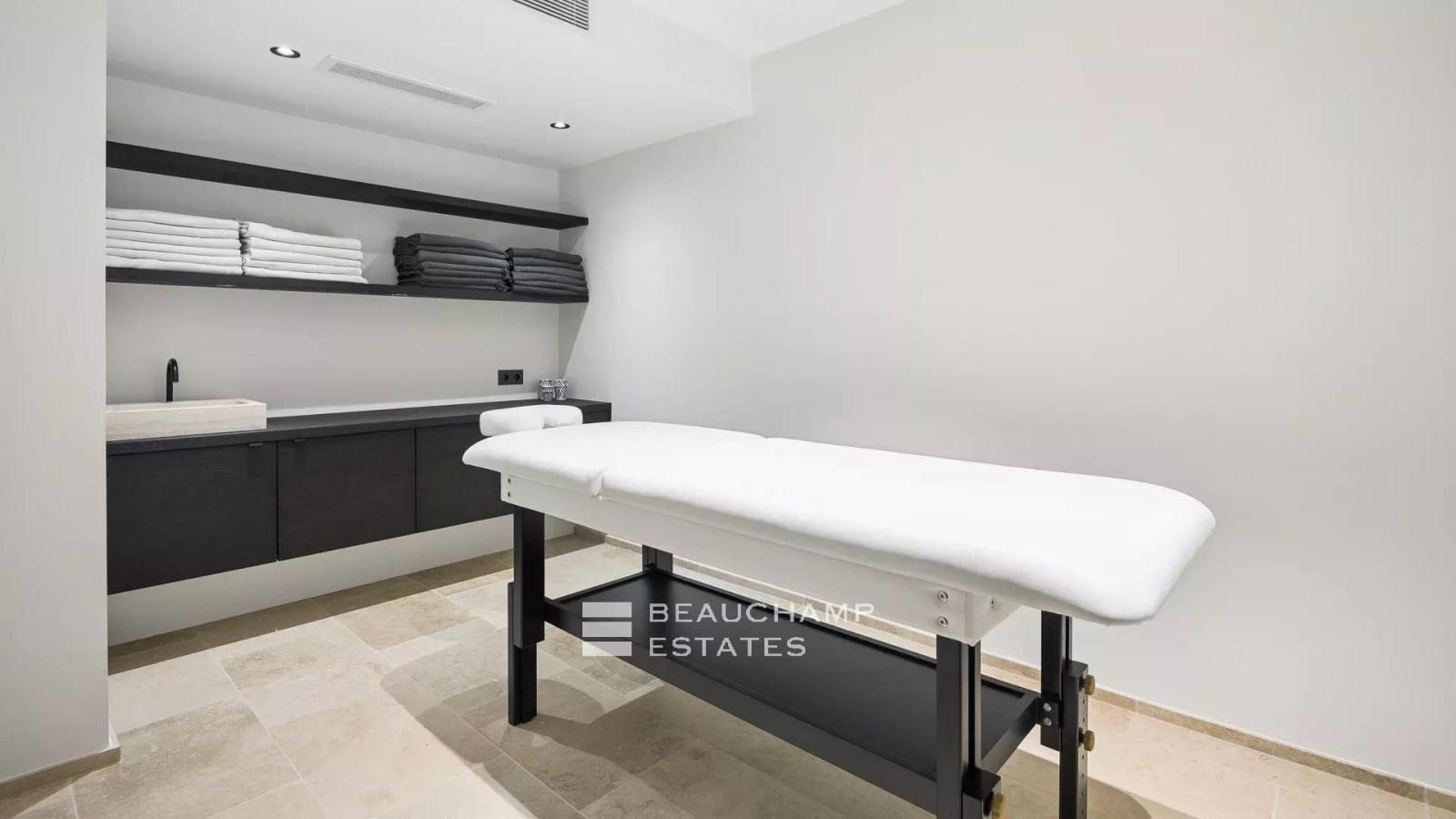 En entresol, vous trouverez deux chambres en suite supplémentaires, une buanderie, ainsi qu’un espace bien-être comprenant un sauna et une salle de massage. Un espace fitness et une salle de cinéma complètent ce niveau.