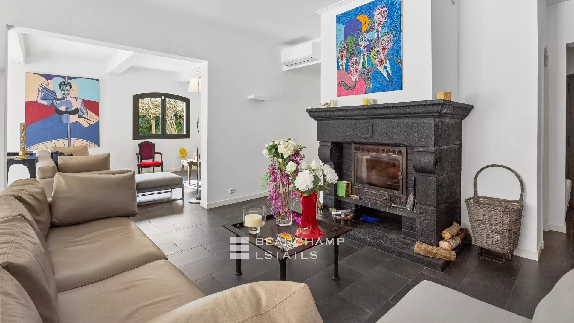 Dès l’entrée, un dressing invités vient souligner le niveau de confort proposé. La somptueuse triple réception de plus de 105 m², agrémentée d’une cheminée, s’ouvre largement sur le jardin paysager, créant une harmonie naturelle entre intérieur et extérieur.