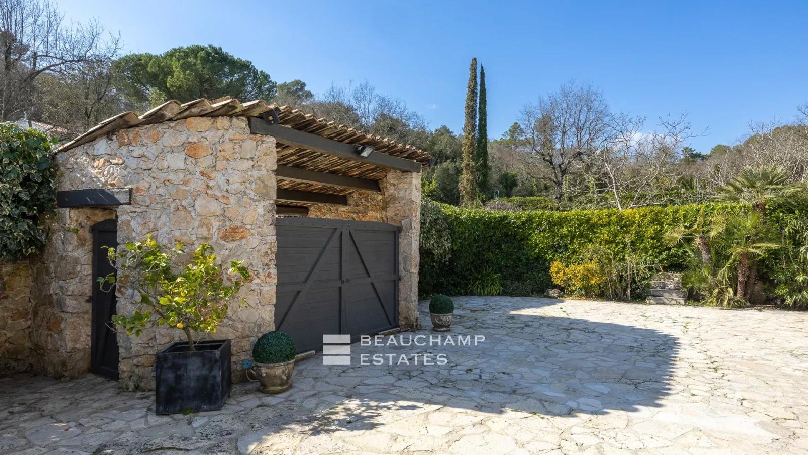 Le jardin paysager, structuré en deux larges restanques, allie raffinement et fonctionnalité : la première accueille la villa, la piscine, le pool house ainsi que de vastes terrasses, couvertes ou à ciel ouvert, tandis que la partie supérieure offre un espace idéal pour un potager ou une aire de jeux.