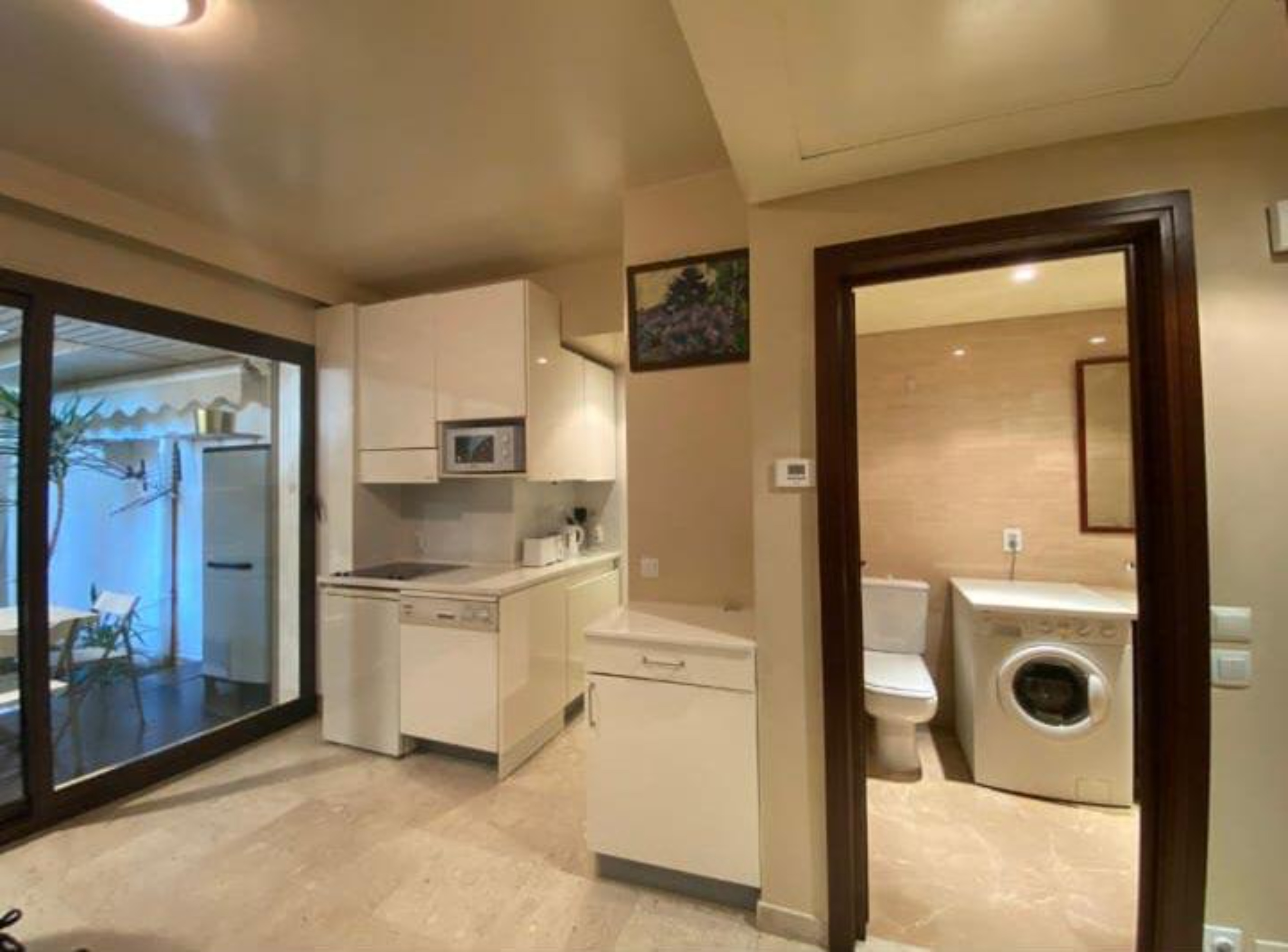 Entrée avec double porte, salon avec kitchenette, salle de bain spacieuse avec baignoire / douche, jardin privé d’environ 17 mètres carrés.