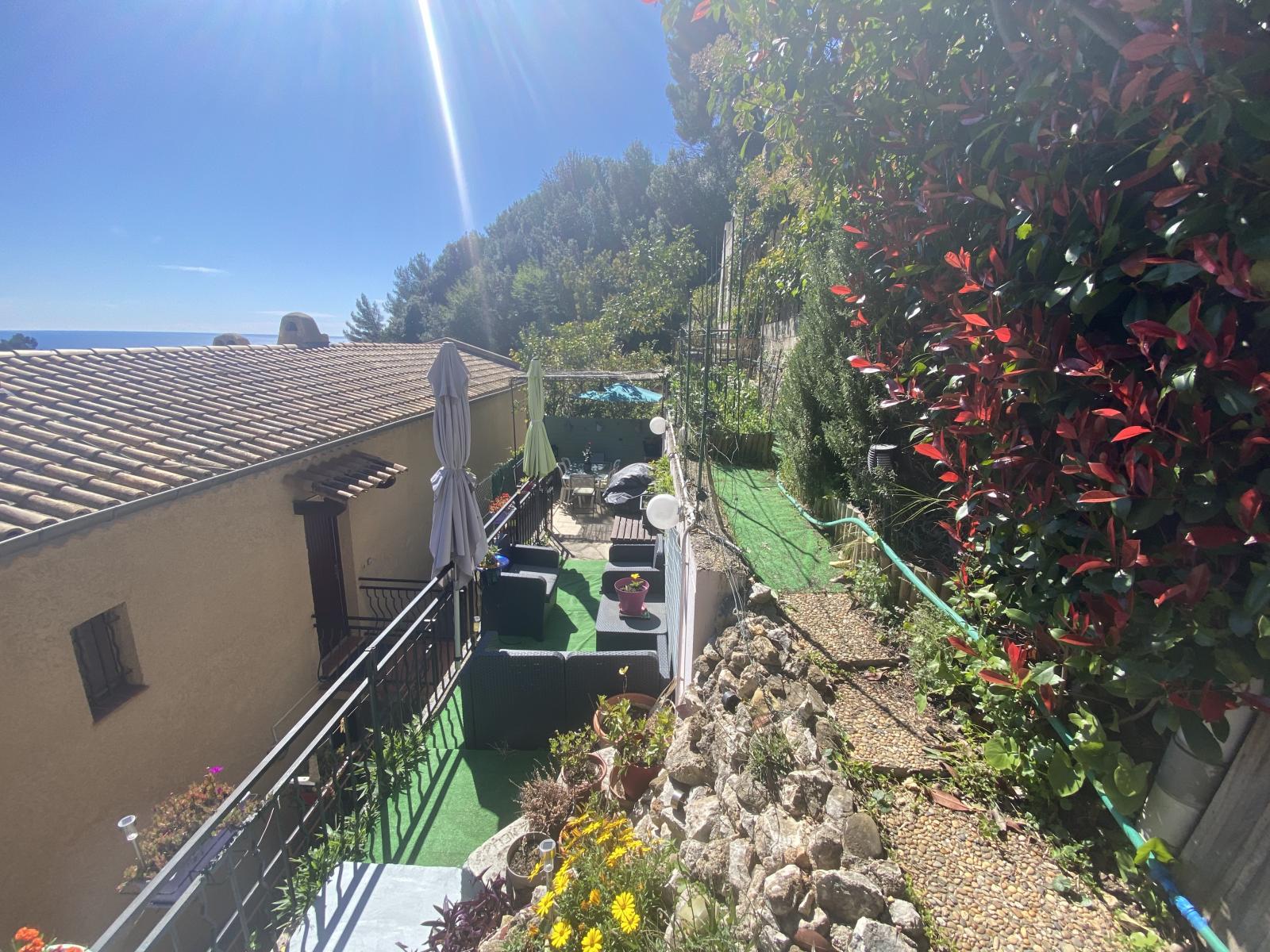 L'entrée mène à un séjour spacieux, associé à une cuisine semi-ouverte créant un espace de vie convivial et un W.C. invité. Cet ensemble s'ouvre sur une agréable terrasse, idéale pour profiter d'un panorama mêlant mer et végétation.